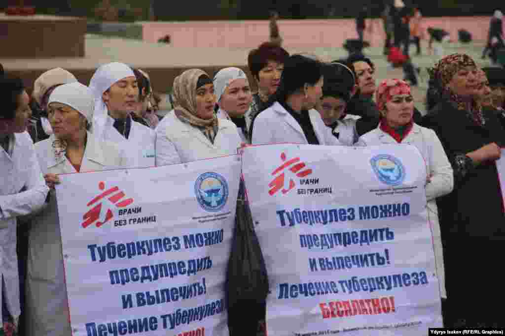 Ош шаарынын борбордук аянтында шаар жаштары кургак учукка каршы акция өткөрүштү. Акцияга келген жаштар “Кургак учукту токтоткула”, “Кургак учукту айыктырууга болот”, “Кургак учуктун алдын алууга болот”, “Кургак учук акысыз дарыланат” деген плакаттарды көтөрүп турушту.