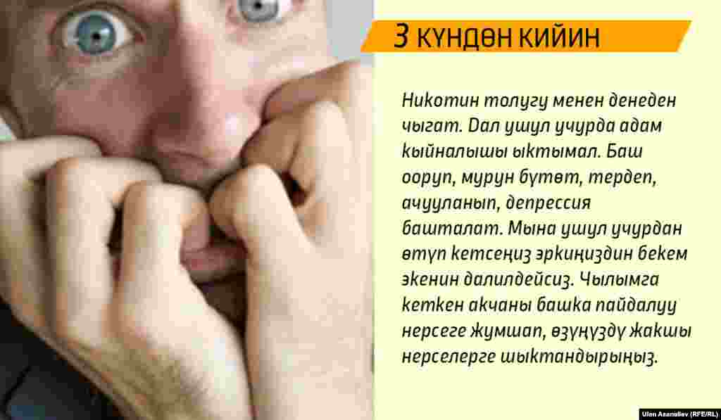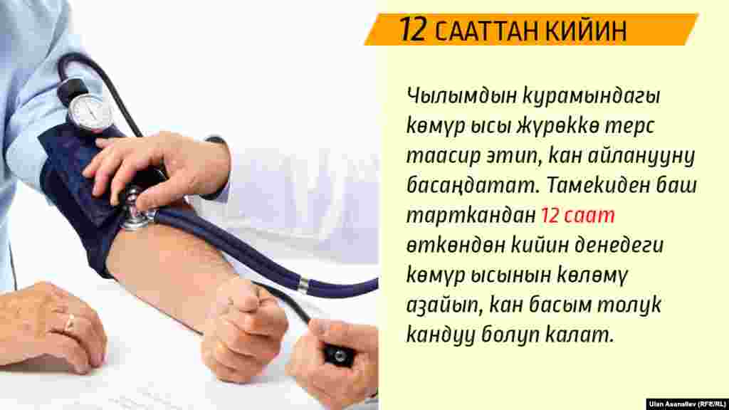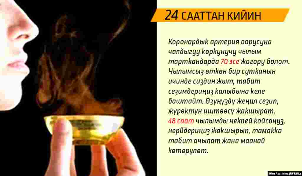 Healthline аттуу коомдук уюм атайын иликтөө жүргүзүп, тамекини таштагандан кийинки 20 мүнөттөн тарта 15 жылдык убакыт ичинде адам саламаттыгындагы төмөнкү кубулуштарды жазган.