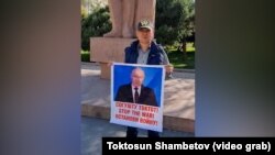 “Путиндин сүрөтүн көтөрүп, астына “Согушту токтот!” деп жазып алып, ал саммитке келген экен, ошондуктан элдин көңүлүн бурайын деп атайын чыктым эле. Украинадагы согушта биздин Кыргызстандын да жарандары өлүп келип жатпайбы. Милиция акция мыйзамсыз экенин айтып жатат, себеби саммит убагында чыкканга эки күнгө уруксат жок экен. Азыр мени коё бергени жатышат, плакатымды алып коюшту, сизди саммиттен кийин чакырып, сүйлөшөбүз дешти”.