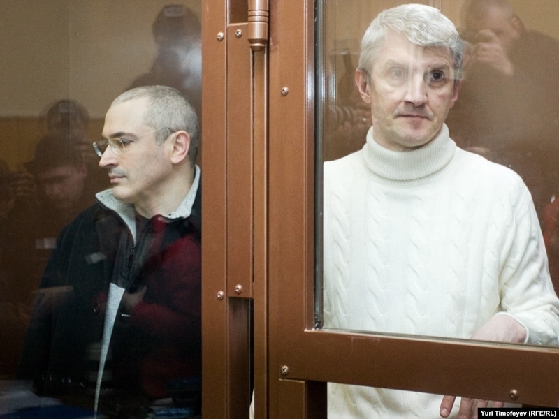 Михаил Ходорковский жана Платон Лебедев Москва сотунун ок өтпөс айнек "торунун" ичинде.31-март 2009-жыл.