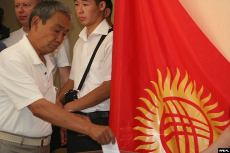 Убактылуу өкмөт башчысынын орун басары Өмүрбек Текебаев добуш берүүгө баратат. 27-июнь,2010-жыл.