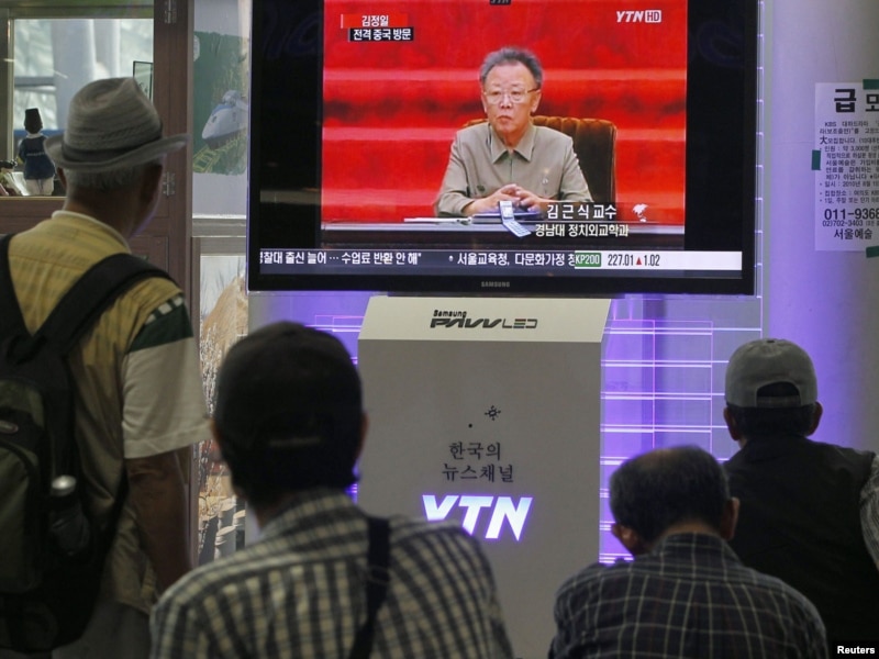 Түштүк Корея телевидениеси Түндүк Кореянын лидери Ким Чен Ирдин Кытайдагы сапары жөнүндөгү кабарды Кимдин мурдакы видеотасмасы менен коштоп берүүдө. 26-август 2010