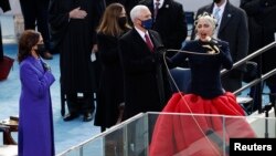 Белгилүү ырчы Леди Гага деңиз аскерлеринин музыканттарынын коштоосунда АКШнын улуттук гимнин аткарды.