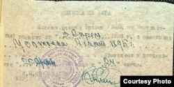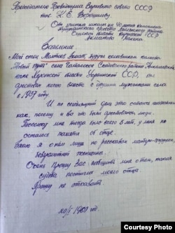 "Атам Акмат Молтоев, “Жаңы Жол” колхозунун колхозчусу, азыркы Украина ССРинин Херсон облусунун Чалбасы айылында, 1937-жылы айылдын башка эркектери менен бирге түн ичинде камакка алынган. Эмне үчүн, кайсы кылмышы үчүн алардын камалганы белгисиз бойдон калууда. Ал кезде мен болгону беш жашта элем, атамды эстей дагы албайм. Атам жөнүндө карыган энемдин айтуусунан, эскерүүсүнөн гана билем. Атамдын башына түшкөн тагдырды мага кабарлап коюңузду өтүнөм. Сураныч, баш тартпаңыз 01/20/1960".