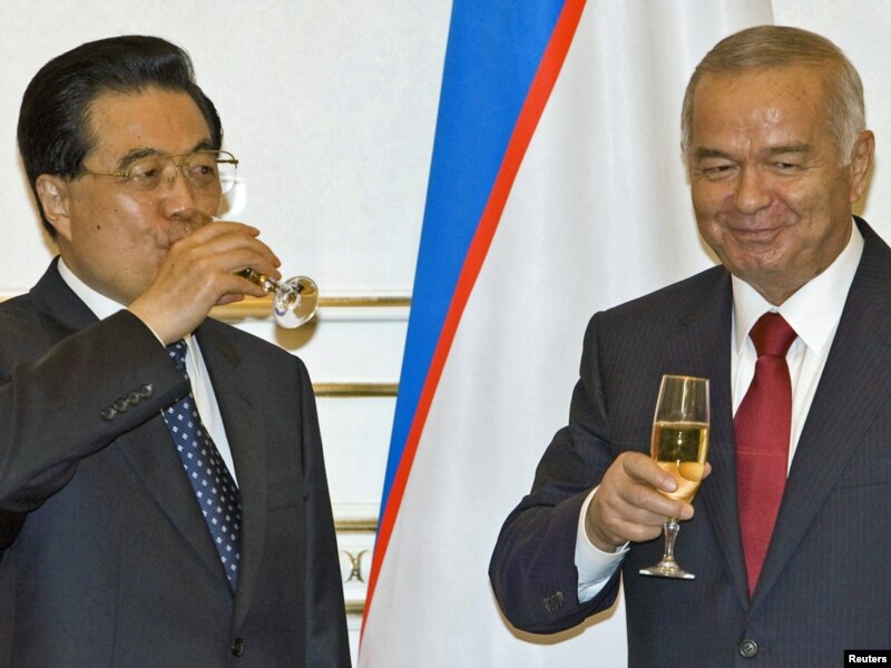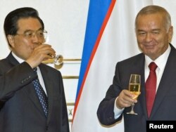 Кытай президенти Ху Цзянтао жана Өзбекстан президенти Ислам Каримов Ташкенттеги кездешүүдөн кийин шампан ичишүүдө. 9-июнь 2010