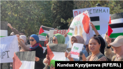 Чогулгандар “Согушка жол жок”, "Эркин Палестина" деген жазуусу бар плакаттарды көтөрүп, Газанын тургундарына жардам берүү үчүн атайын эсеп ачуу демилгесин көтөрүштү.