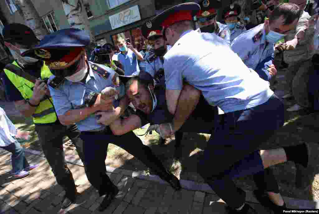 Казакстандын бир нече шаарында “Тынч жыйындар жөнүндө” мыйзамга нааразылык билдирүү үчүн митингге чогулган ондогон адамдар кармалды.
