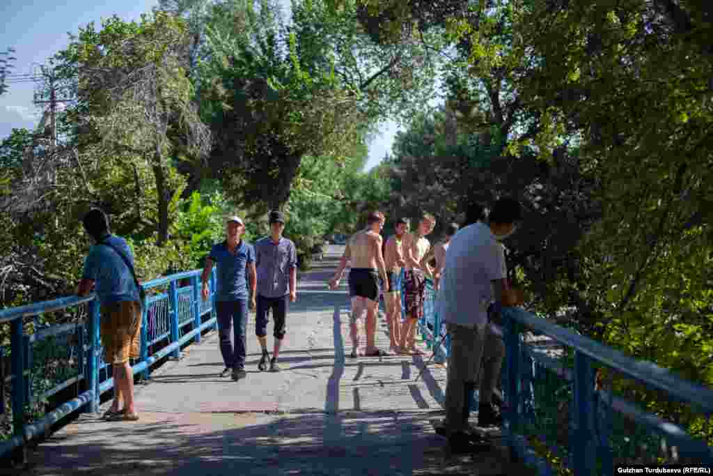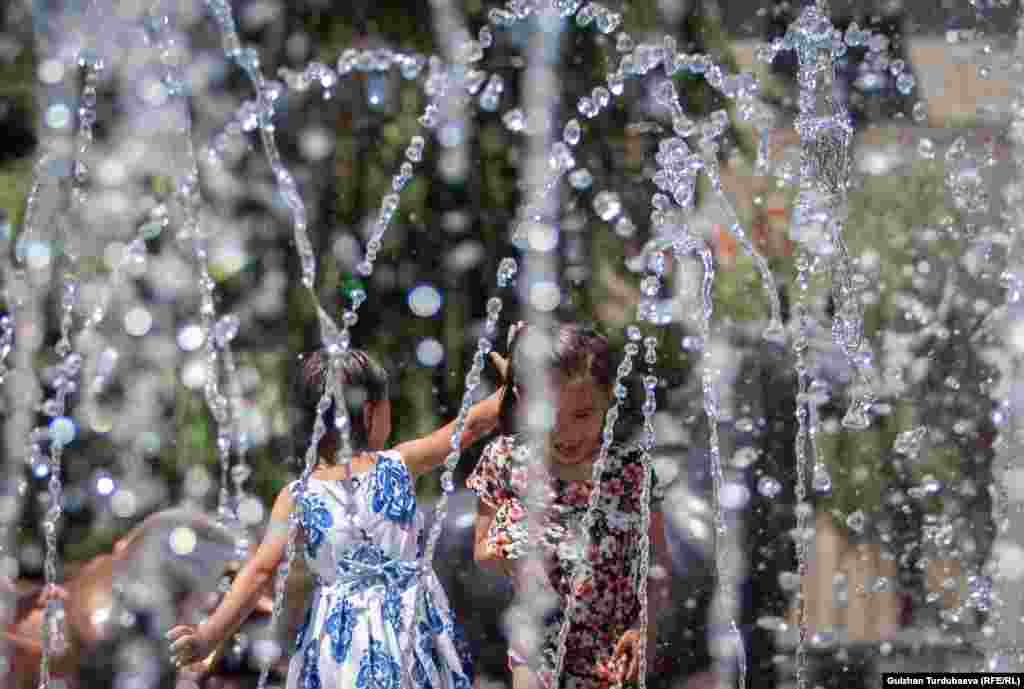Майда балдар фонтандарда ойносо, чоңдор Чүй каналына чумкуп ысыктан сактанат.