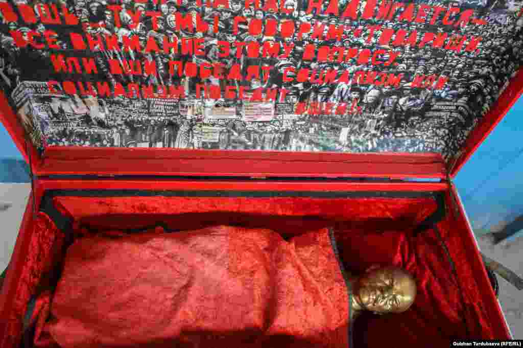 Сүрөтчүнүн эмгектеринин арасынан кызыл жоолукчан Ленинди, советтик идеологиянын аша чапкан ураандарын да көрүүгө болот.