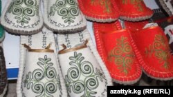 Кыргыздын улуттук буюм-тайымдарын сатып жаткан дүкөндөрдөн "Кыргызстан" деген жазуусу менен кошо эле "Казакстан" деген сөздү жана казак тилинде жазылган аталыштарды көбүрөөк көрүүгө болот.