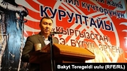 Жогорку Кеңештин экс-депутаты Равшан Жээнбеков бийлик бутактарынын тең салмактуулугу, өлкөнүн келечеги, экономикалык маселер боюнча доклад жасап жатат. Ал курултайды өткөрүүгө бийлик менен диалогго барганын айтты.