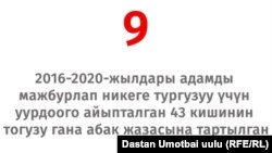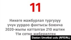 2016-жылдан 2020-жылга чейин сотко жеткен 43 ишти изилдеп чыгып, алардын ичинен тогуз айыпталуучу гана абак жазасына тартылганын аныктадык. Алар жарым жылдан беш жылга чейин эркинен ажыратылган.