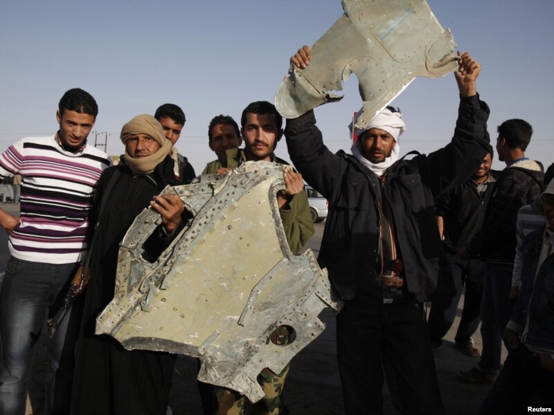 Ливиялык адаватчылар өздөрү атып түшкөн аскерий учактын сыныктарын көрсөтүшүүдө. Аждабия аймагы. 3-март 2011