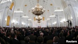 Путин жылдык кайрылуусун Кремлдеги Ыйык Георгий залында жасады. 70 мүнөттүк сөзүндө ал Орусияда мигранттардын көбөйүшү пайда кылган кыйынчылыктарга кайрылды: