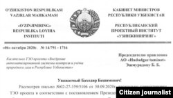 «Азаттык» радиосунун өзбек кызматынын колуна тийген дагы бир документ - бул «Узинжиниринг» мамлекеттик долбоорлоо институтунун директорунун биринчи орун басары Ш.Шаймардоновдун «Худудгазтаъминот» акционердик коомунун төрагасы Б.Эшмуродовго жазган каты.