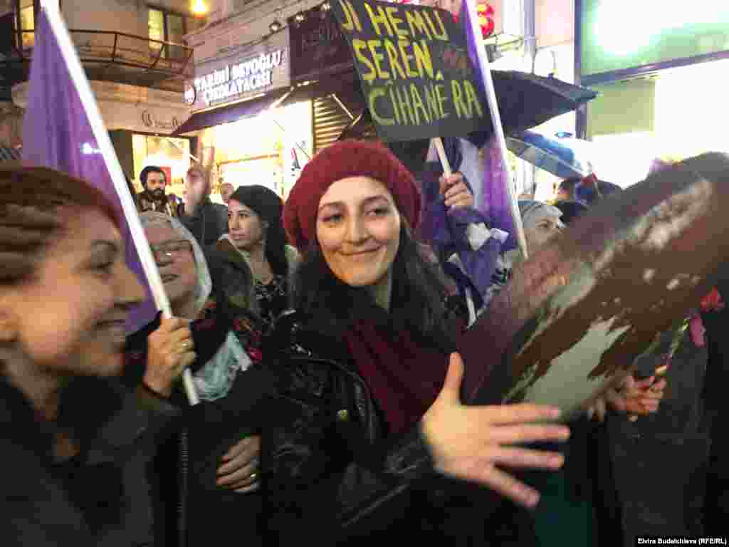 Бул жылы 16-жолу уюштурулган иш-чарада коомдо аялдардын укуктарынын тебеленишин, зордук-зомбулукту айыптаган, сөз эркиндигин талап кылган жазуулар бар кагаздарды көтөрүп чыгышты.