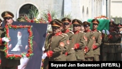 Ооганстандын үч түстүү туусуна оролгон табытты маркумду акыркы сапарга узаткандар жана өлкөнүн гимнин ойногон аскердик ансамбль коштоду.